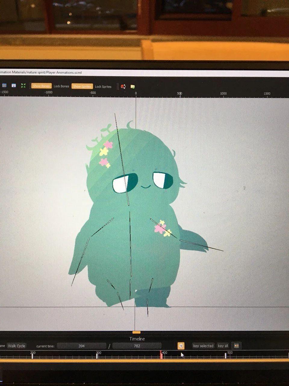 To ensure we had working player models as soon as possible, I collaborated with the artist to puppet animate the nature spirit using Spriter Pro. They rendered individual body parts for the character before passing them off to me for assembly and animation. Once the animation was keyframed in Spriter, I exported a spritesheet for our developers to implement in Unity.